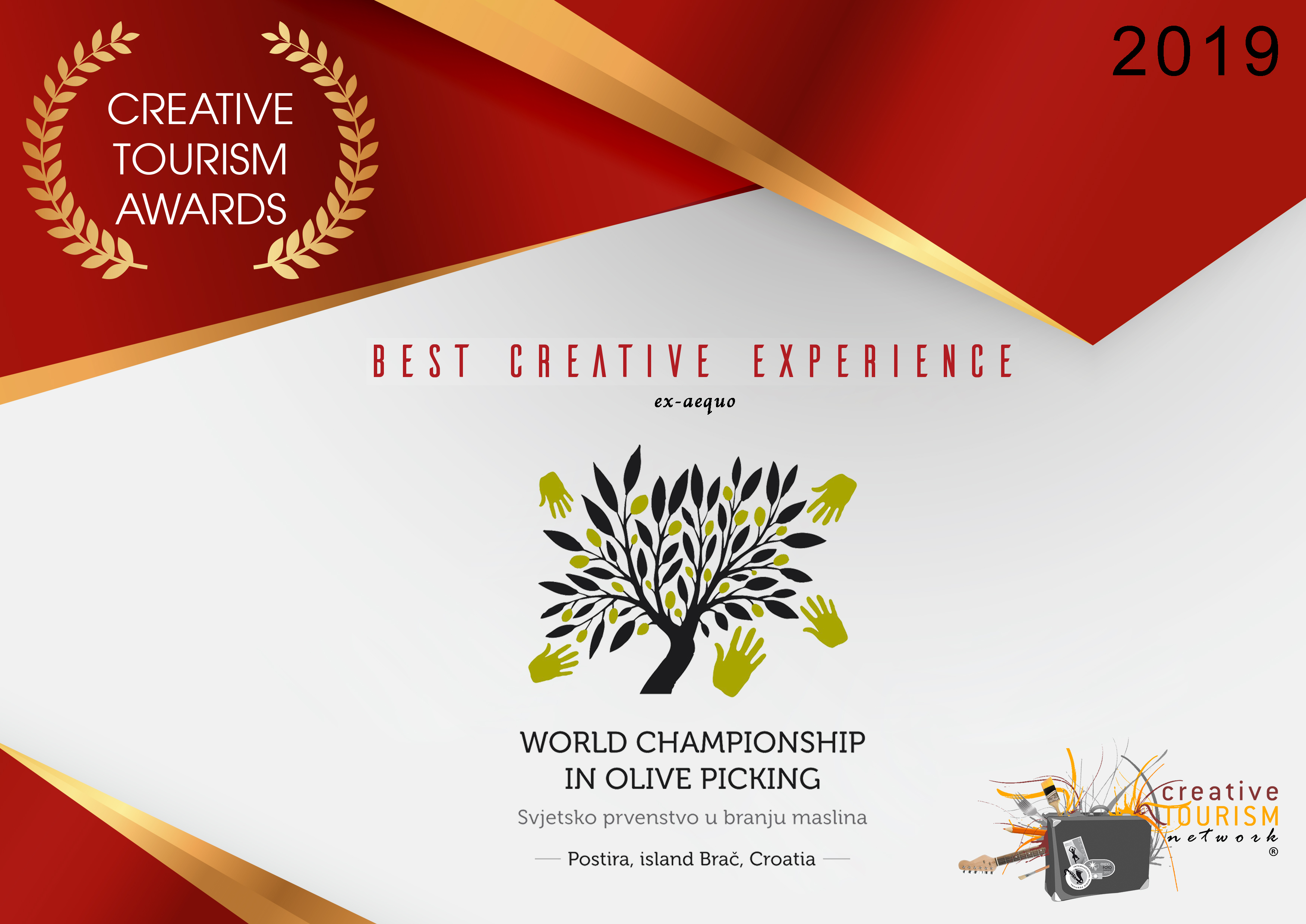 El pasado 22 de enero se celebró en FITUR (Madrid), el acto de la entrega del premio para la Best Creative Experience 2019, organizado por el CreativeTourismNetwork®. Dicho galardón, de nivel mundial, fue otorgado a la Municipalidad de Postira (Croacia), para su World Olive Picking Championship (Campeonato Internacional de Recolección de Aceitunas).